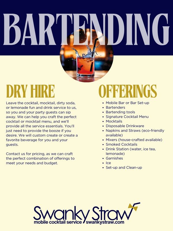 Swanky Straw is a premier mobile bartending service dedicated to bringing exceptional cocktail and mocktail experiences right to your doorstep. Whether it's a private party or a corporate event, we provide professional bartending and mixology to elevate your gatherings.